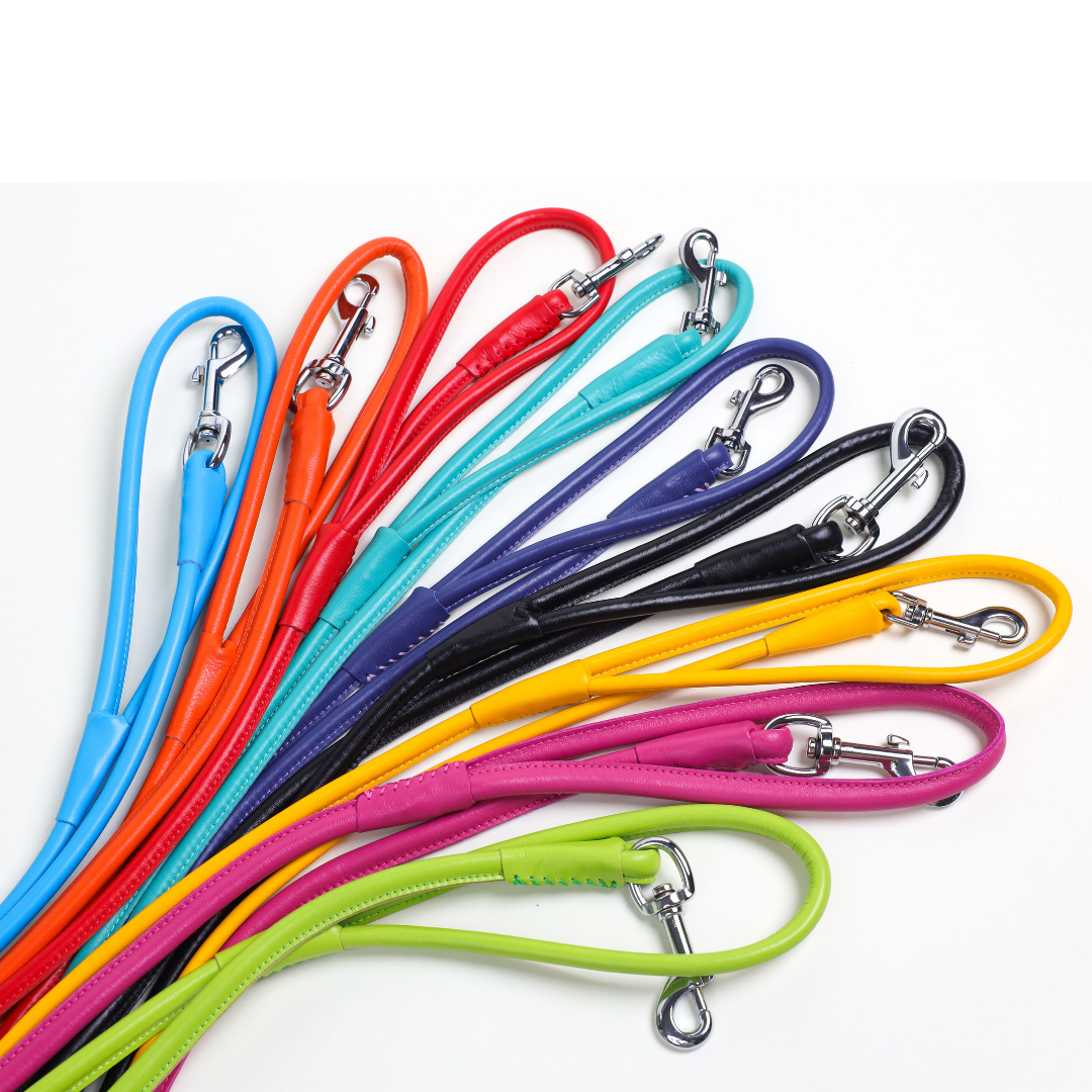 -Description: Leather leash of colors blue, orange, red, navy blue, black, yellow, green and pink